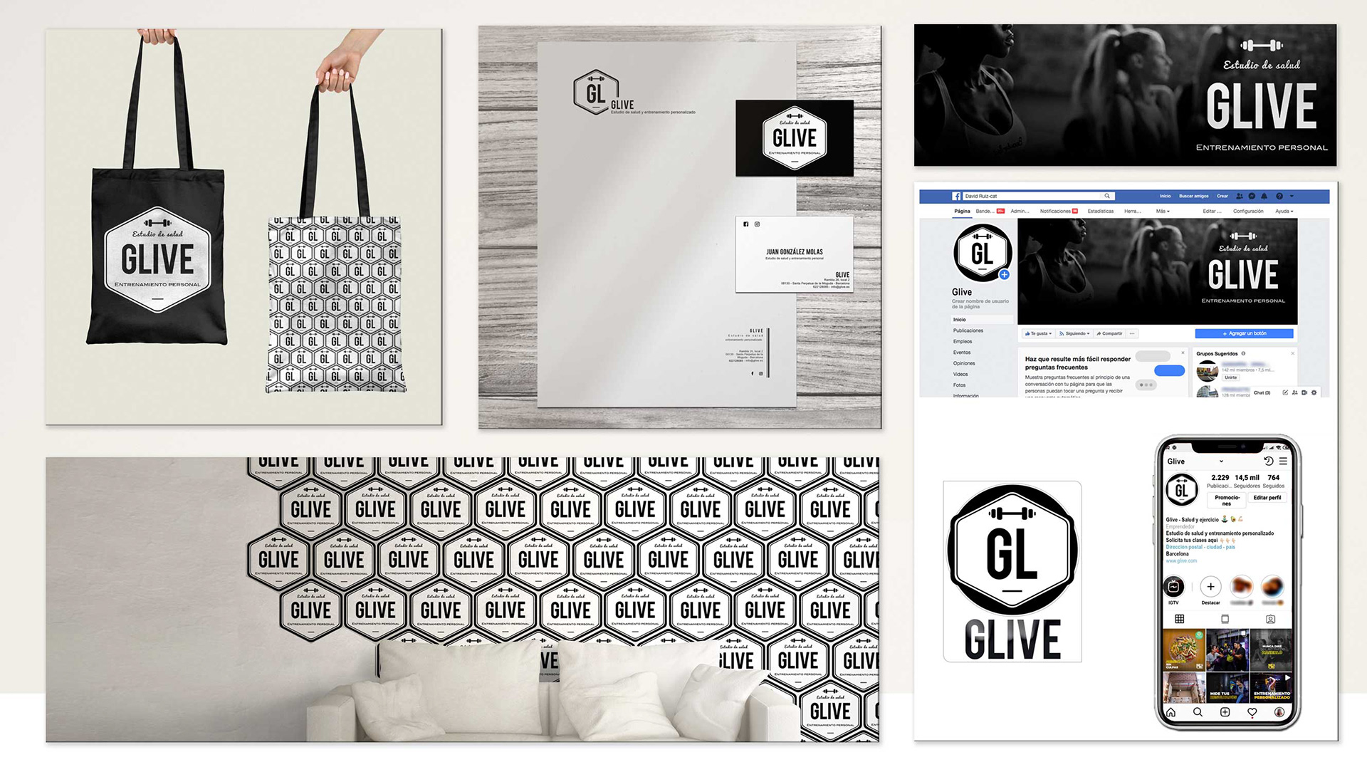 Glive, logo design and application on different surfaces, merchandising and its application on social networks
